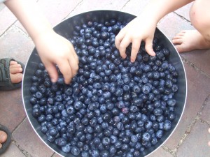 When we got back from blueberry picking at Estes Farm the other day, we had lots of berries to wash and eat. Connor likes them, and Ian LOVES them, but even so we had more than we could eat fresh right away. Thankfully, the freezer is a really easy option for preserving fresh fruit. While vegetables need to be blanched before freezing, fruits do not, so freezing them is quick. There are several methods for freezing fruits. Some people like to freeze fruits in a sugar syrup, called a syrup pack, or using a sugar pack, which is where sugar is sprinkled over the fruit and mixed gently, which allows the sugar to dissolve and mix with the fruits own juices. You can also freeze fruits in unsweetened fruit juice, or in a pectin syrup. My personal preference, however, is to freeze fruits as is, with nothing added at all. This method, known as dry pack, is by far the simplest, quickest method, and the results are excellent. And I like the fact that that this approach doesn’t require any added sugar. I also end up with a much more versatile product this way–I can pull the fruits out of the freezer and use them in any number of ways, adding sugar at that time if I need it, or not.
